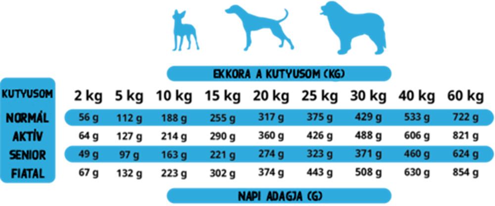 Ne feledd! A táblázat értékei csak referenciapontként szolgálnak. A napi adag mennyiségét nagyban befolyásolhatja a kutya fajtája, kora vagy fizikai aktivitásának szintje – így szükség esetén módosítható.